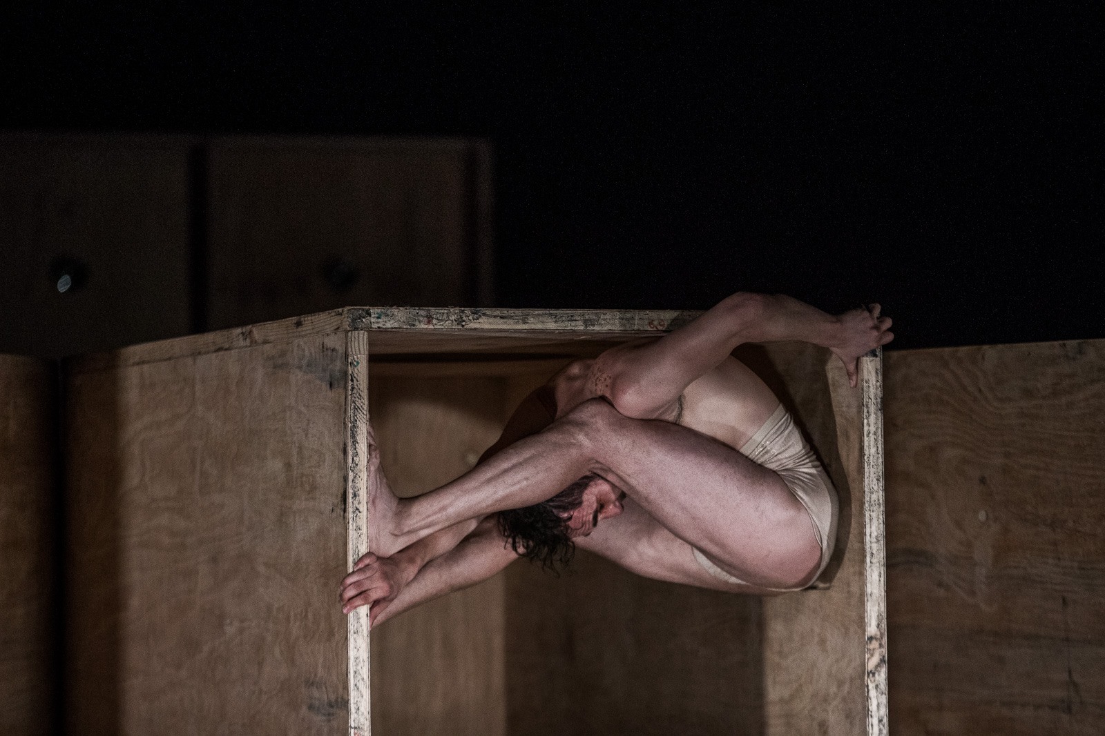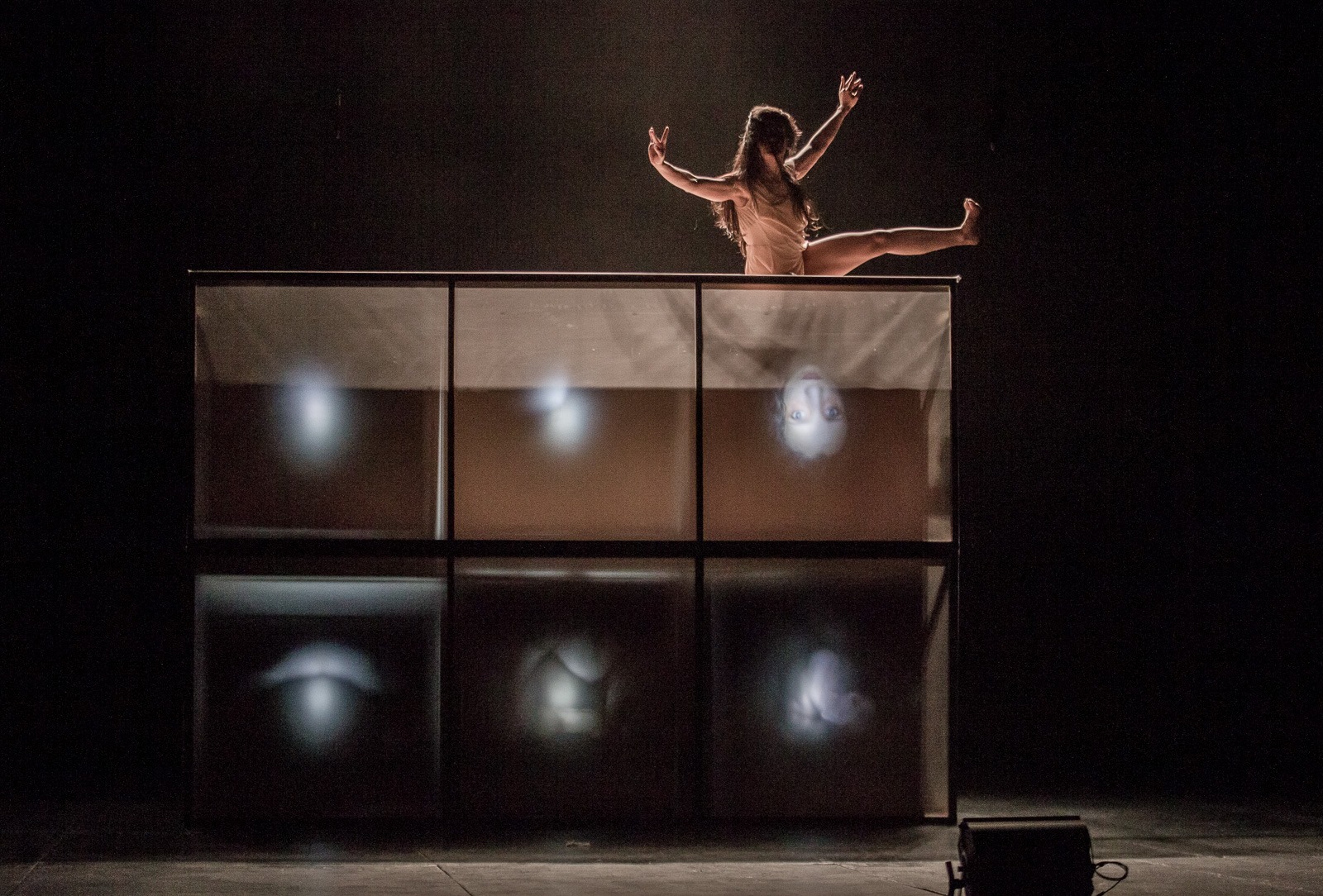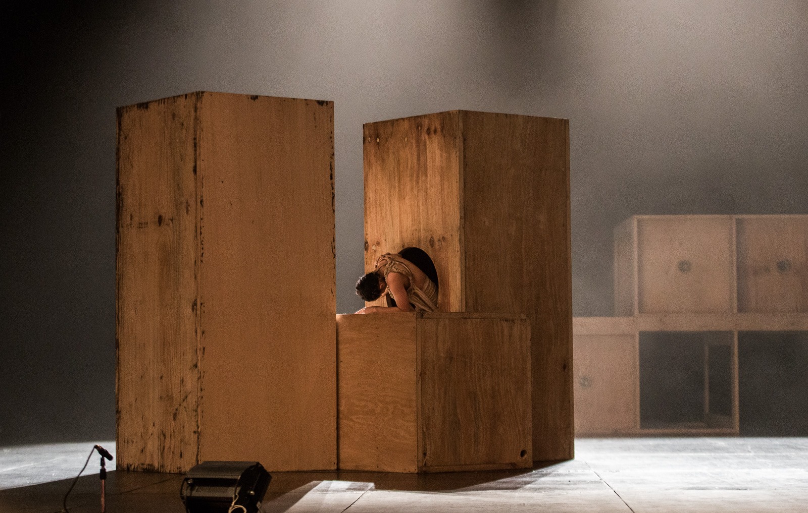 “By stating that all artistic language has sound, image and movement, research will be carried out around the artist team’s concerns about the stage space and its sonic possibilities, linking sound and object as a primary actor in the scene. From this, the design is thought of as a sound-stage set according to the structure of a Columbarium (1) and with the characteristics of a pinhole camera (2). Throwing a theme that becomes a detonator of a narrative and conceptual support: death, the transformation of the dead body and the space it occupies. Having then the sound body as the main study of the action and the dead body as a study, axis of the plastic and narrative, the scenery becomes a large screen that glimpses the image and amplifies the sound: the body in motion, sound and the image are the protagonists.